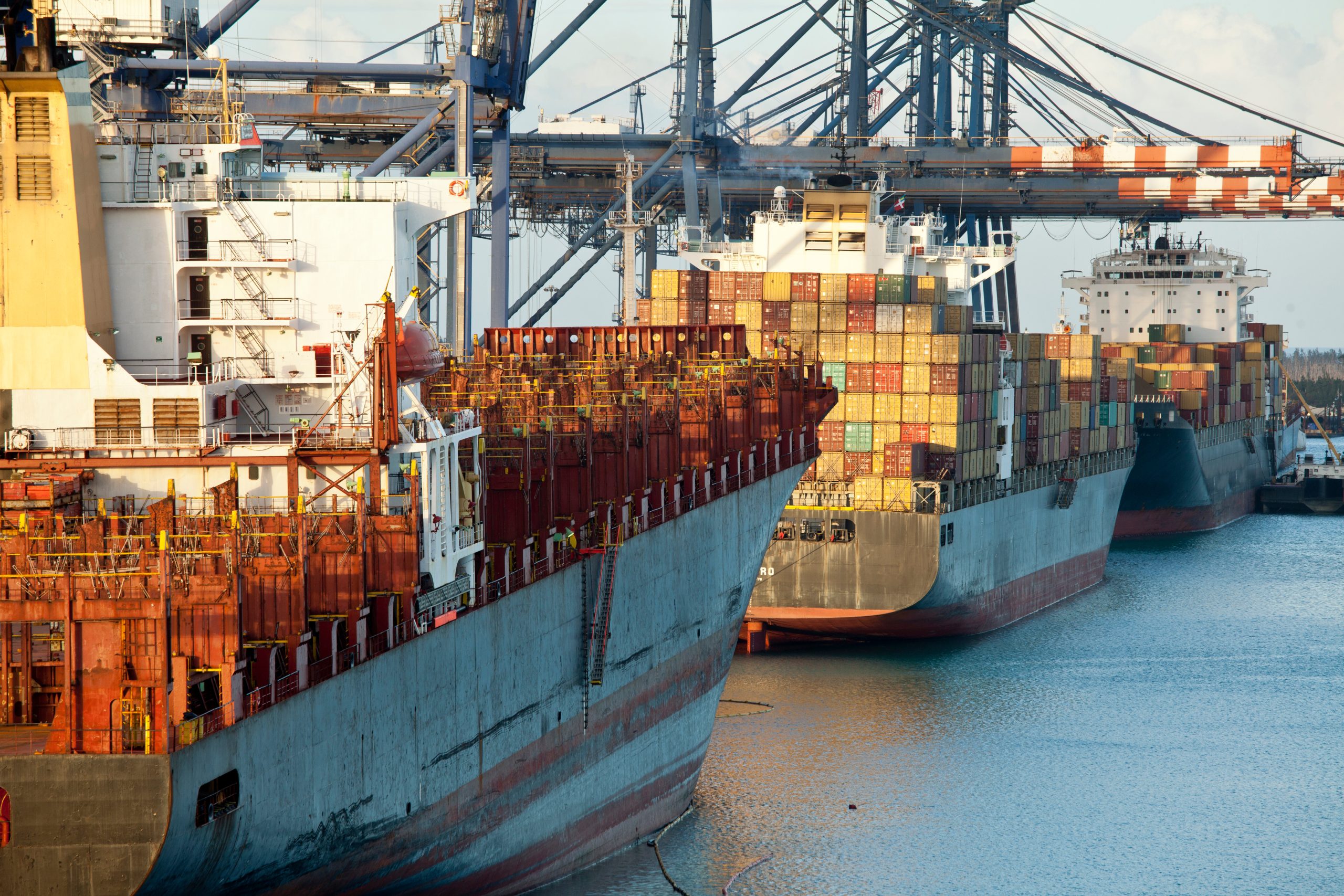 Container ships lining up in port at Freeport, Grand Bahamas. Our services include temporary import/export of cargo and transshipment handling.